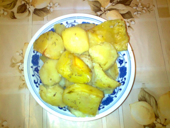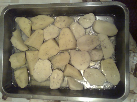 Cartofii se taie in jumatati. Se pun intr-o tava si se presara sarea si rozmarinul. Se stropesc cu ulei de masline si se pune putina margarina sau unt. Se baga la cuptor.