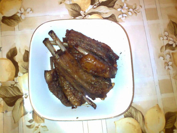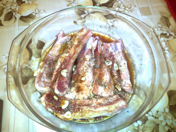 Se portioneaza costitele de porc si se aseaza intr-un vas de yena. Se presara sarea, piperul, boia. Se stropeste cu sos de soia dupa gust si se adauga usturoiul tocat cu cutitul. Se pune putina apa. Se baga la cuptorul incins inainte, la foc mic, circa o ora. Cam la jumatate de ora se intorc costitele pe partea cealalta.